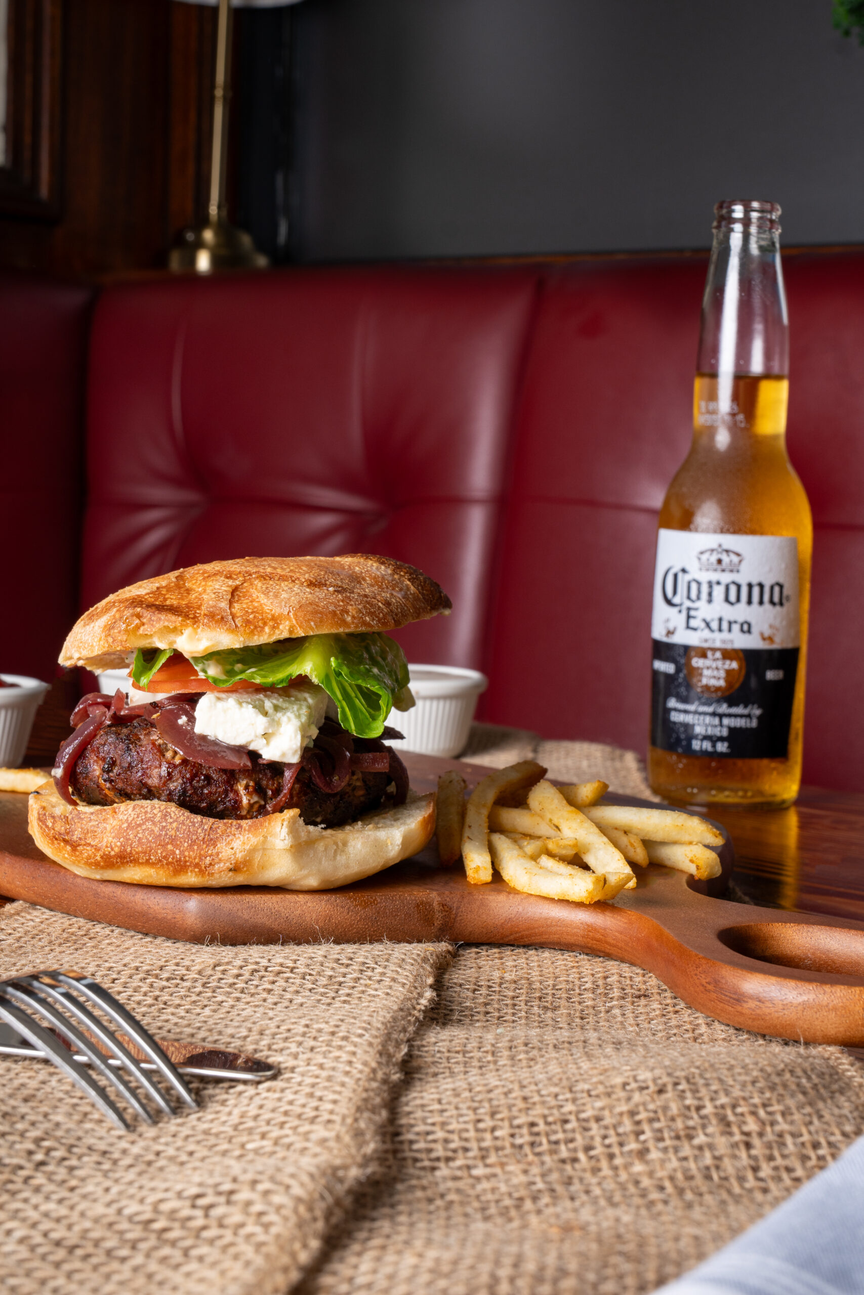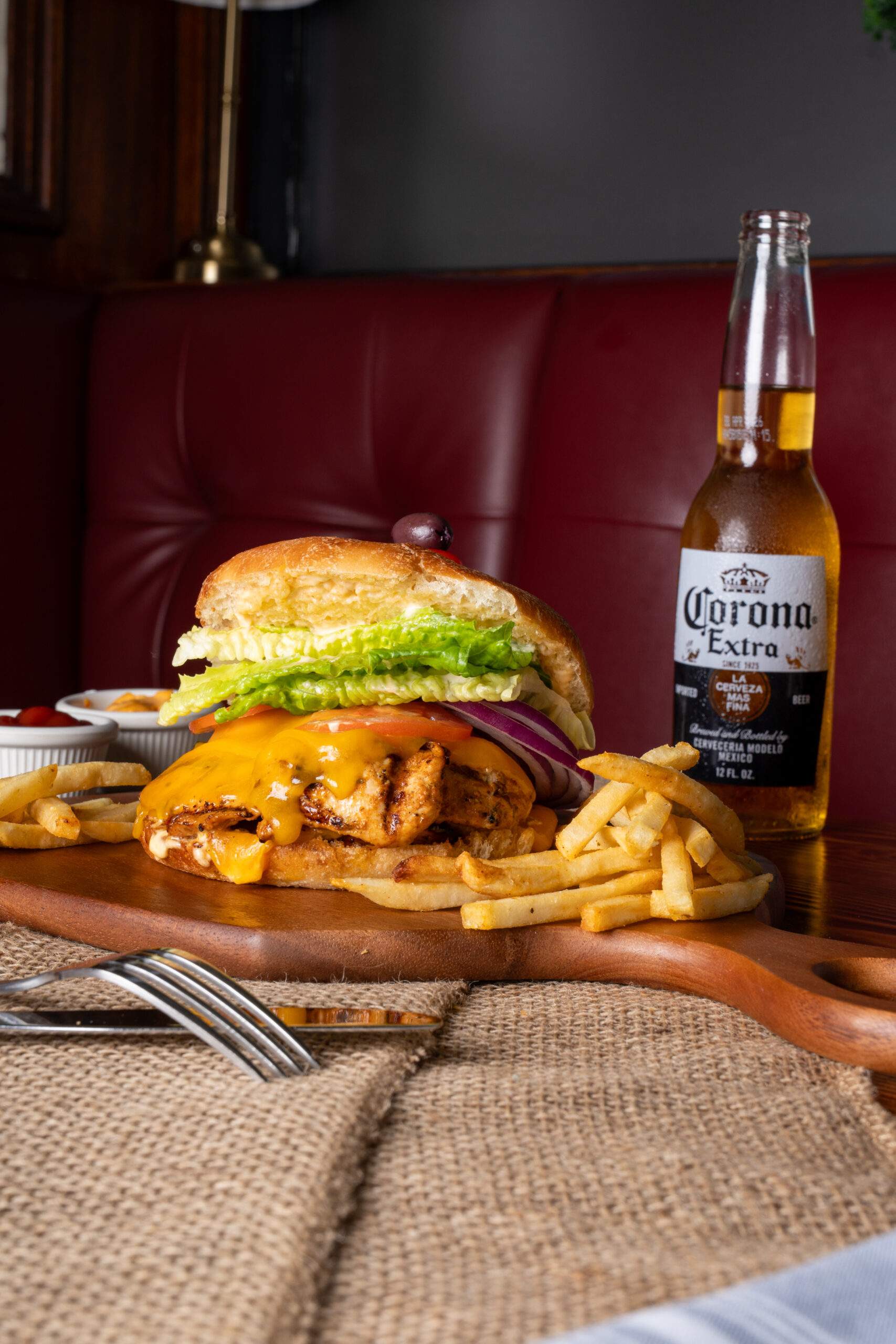Homemade bread roll, 8oz beef, lettuce, tomatoes, onion, cheddar, house aioli, french fries.