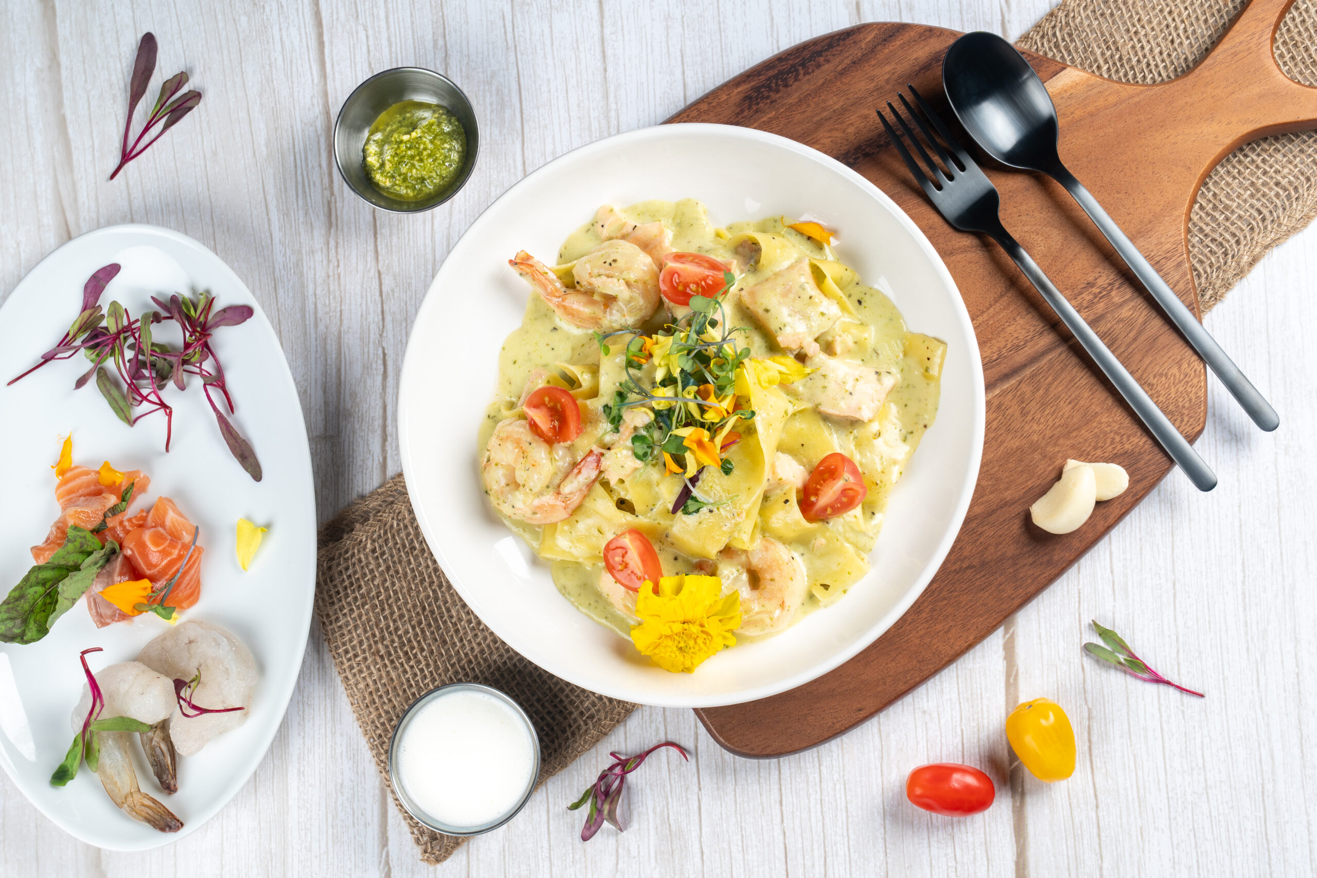 Mussels, prawns, salmon, calamari, garlic, white wine, marinara sauce.