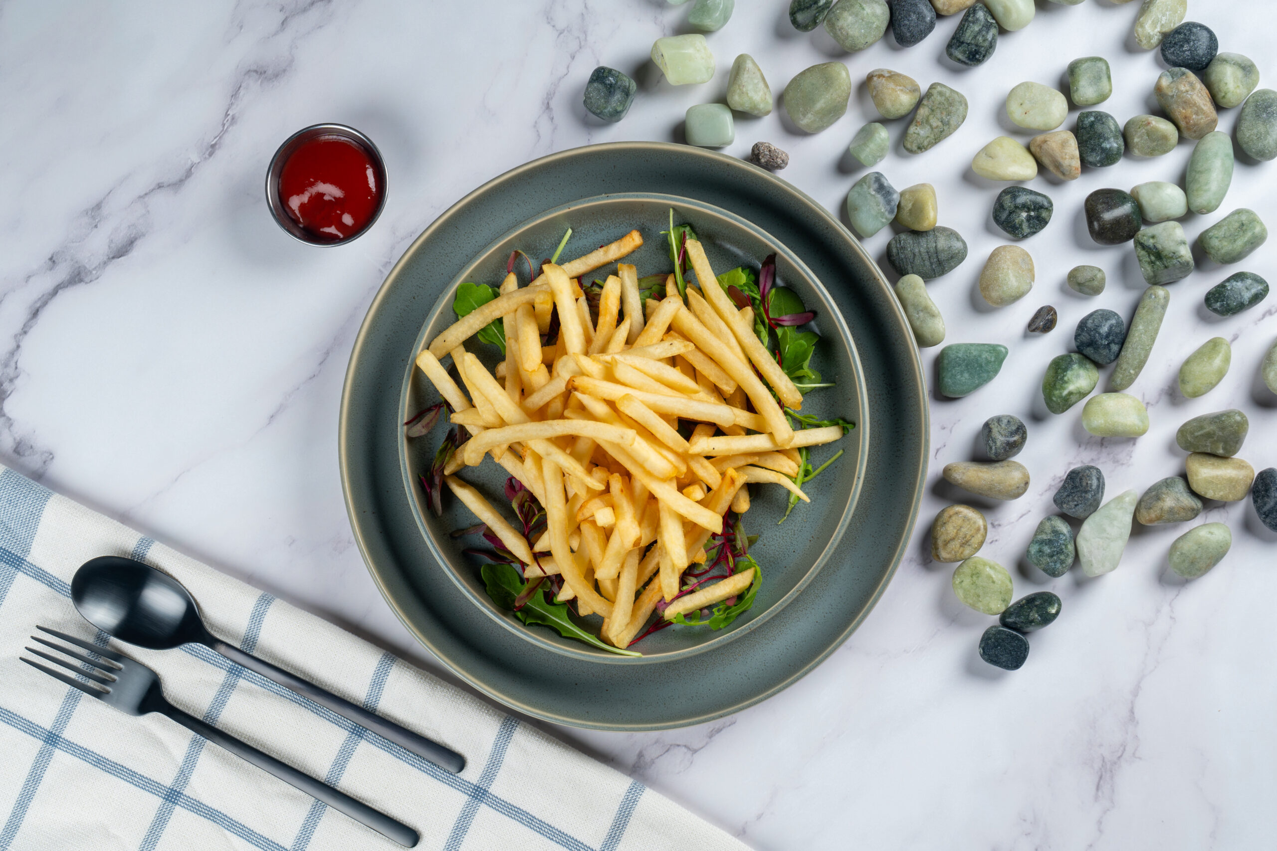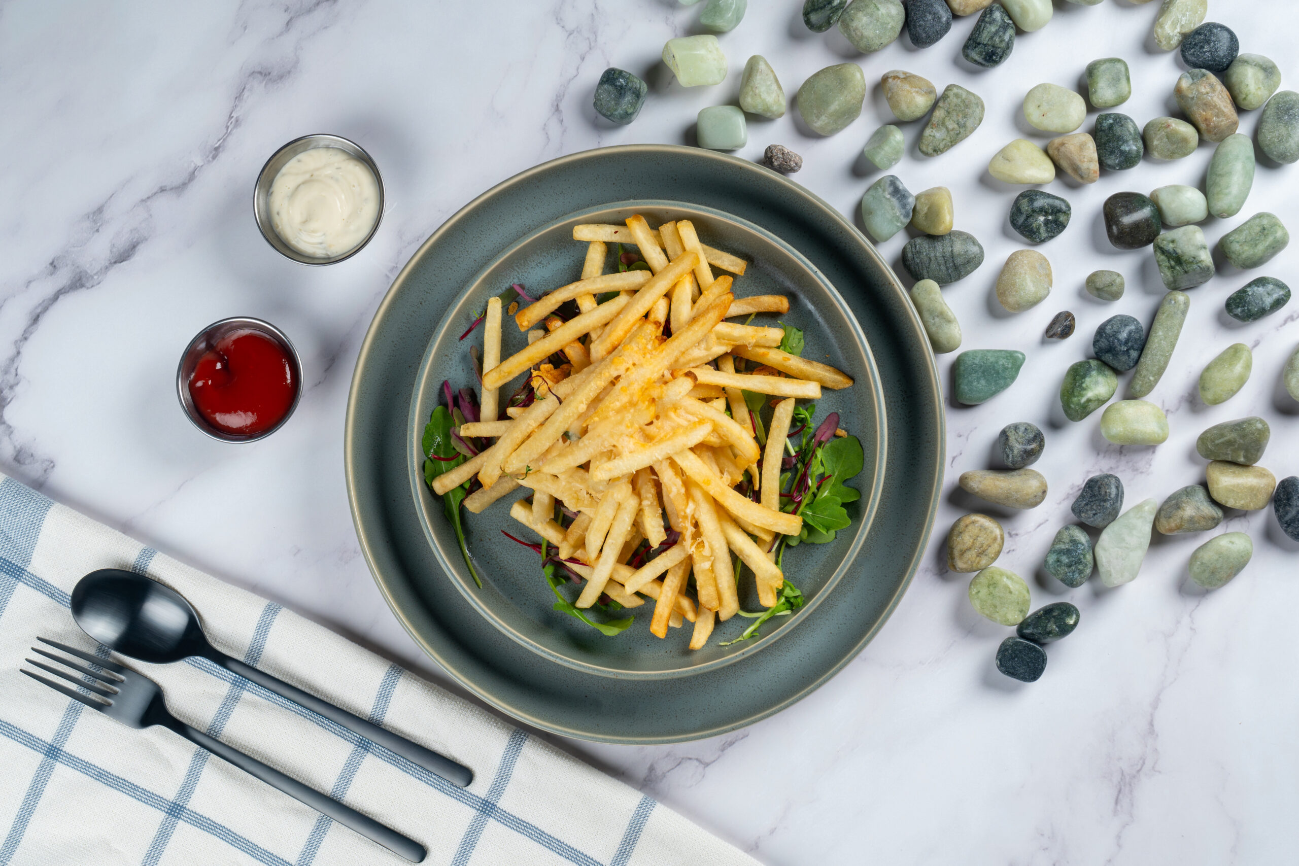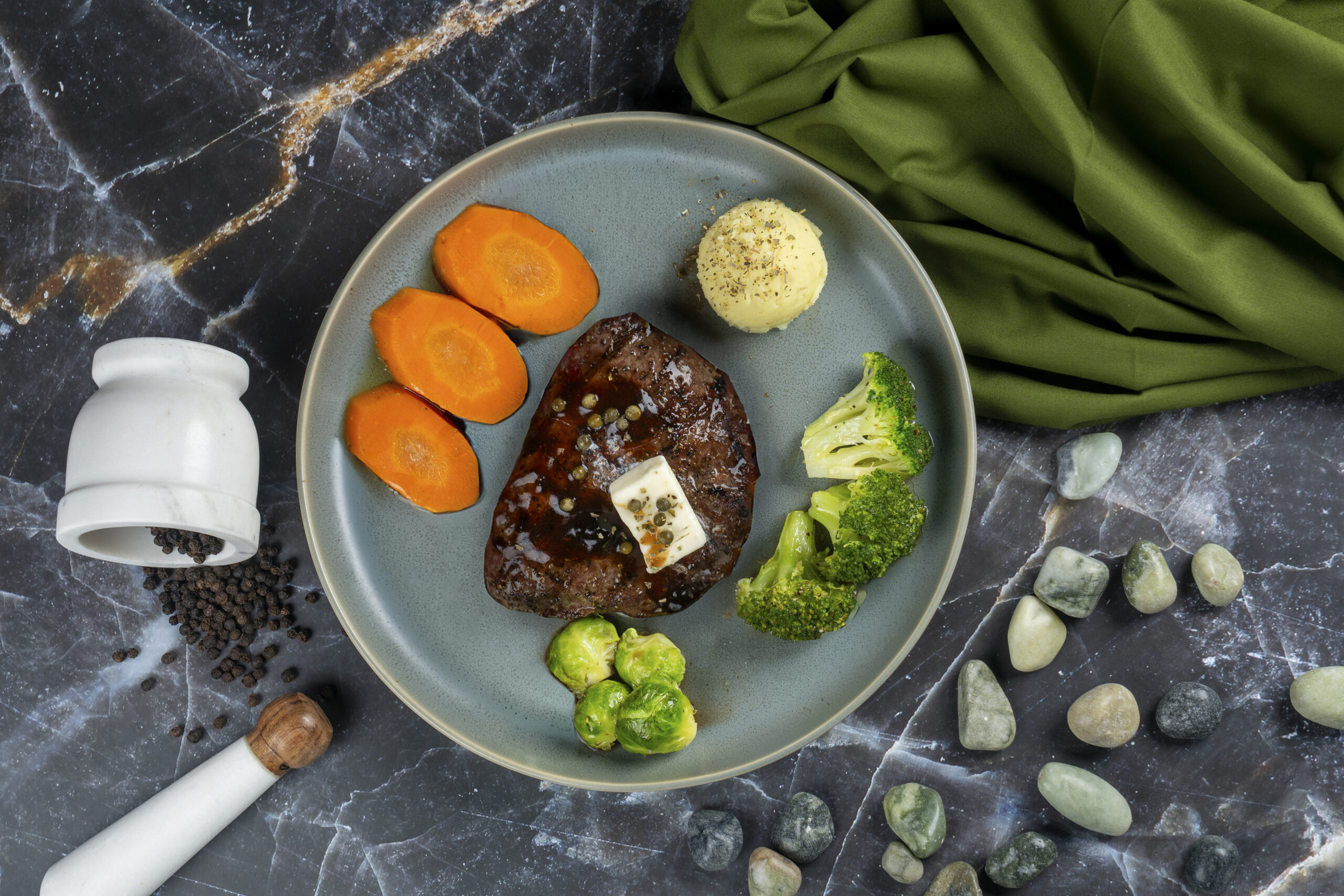 Green peppercorn oregano butter sauce, seasonal vegetables, french fries.
