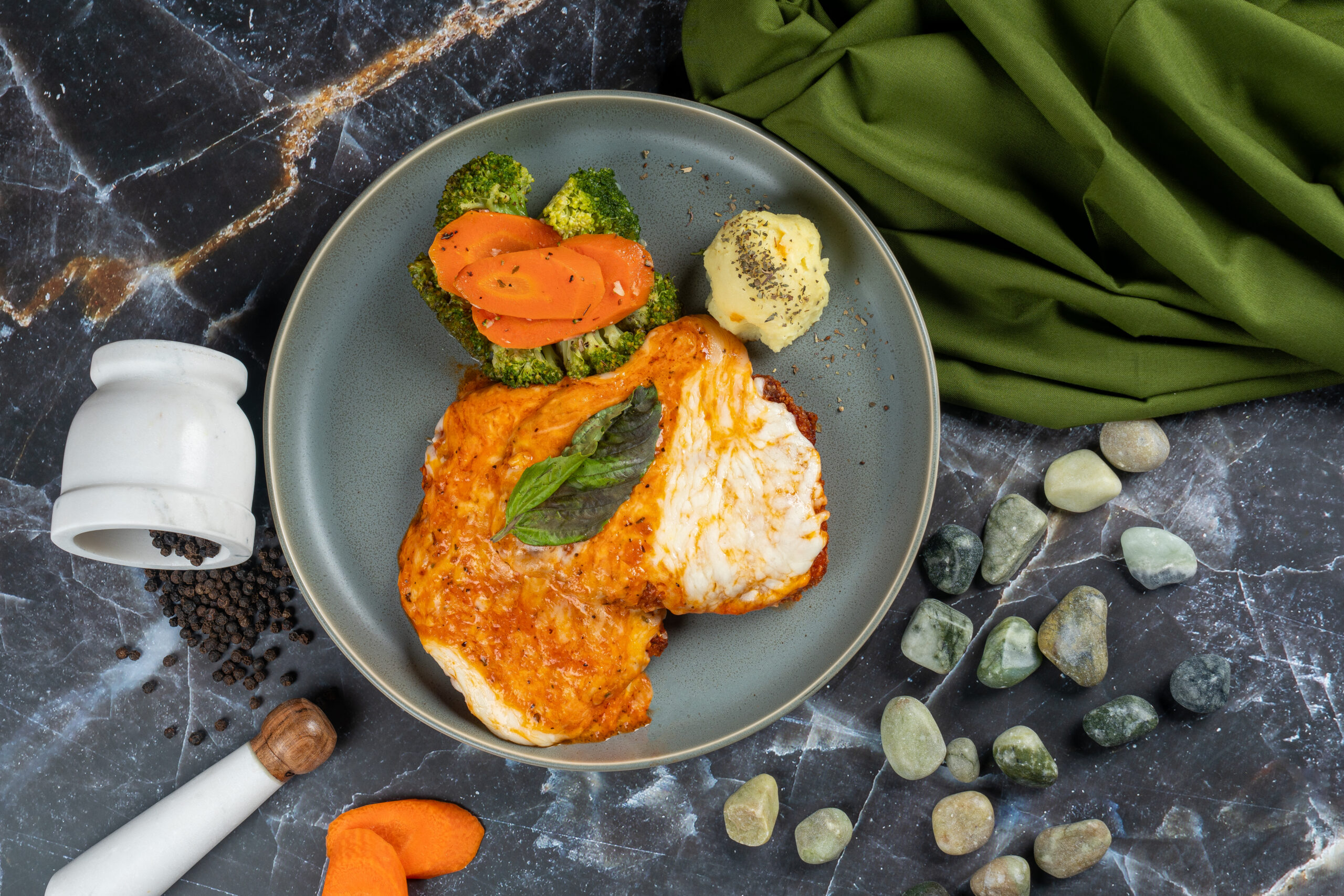 Chicken breast baked in marinara, mozzarella cheese, mashed potatoes, vegetables.